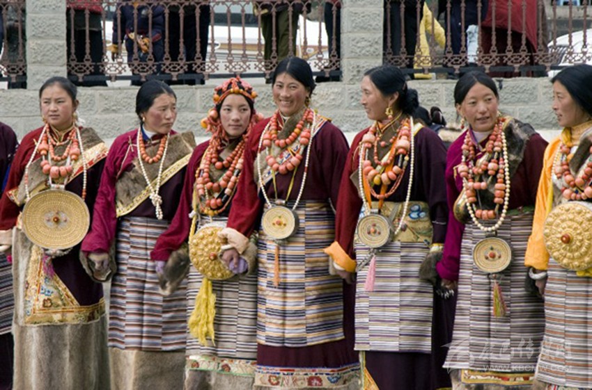 被稱為“瘋裝”的鄉(xiāng)城婦女服飾,最初形成于文成公主進(jìn)藏時(shí)期,于云南麗江納西族木氏土司統(tǒng)治時(shí)期定型,并吸納納西族婦女穿的齊膝圍裙的形狀特點(diǎn),它的特點(diǎn)是褶皺多,分內(nèi)折、外折各54個(gè)。左右胸襟分別鑲有紅、黃、綠、黑、金五塊三角形布料,它們分別代表福壽、土地、先知、牲畜、財(cái)富。瘋裝,寄托著把人間福氣都聚齊了的寓意。雙袖肘處鑲有一片彩色布料,占整個(gè)衣袖的三分之一,袖邊嵌一小塊寸許寬綠布。裙鑲約1厘米粗的紅色羊毛條;背部嵌1.5尺見(jiàn)方稱為“公熱”的墊背。