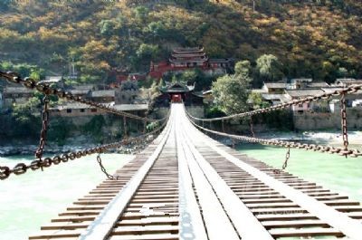 瀘定橋橋長(zhǎng)103米,寬3米,13根鐵鏈固定在兩岸橋臺(tái)落井里,9根作底鏈,4根分兩側(cè)作扶手,共有12164個(gè)鐵環(huán)相扣,全橋鐵件重40余噸。兩岸橋頭堡為木結(jié)構(gòu)古建筑,風(fēng)貌獨(dú)特,為我國(guó)國(guó)內(nèi)獨(dú)有。自清以來,此橋?yàn)樗拇ㄈ氩氐闹匾ǖ篮蛙娛乱颉?935年5月29日,中國(guó)工農(nóng)紅軍長(zhǎng)征途經(jīng)這里飛奪瀘定橋而使該橋聞名中外。