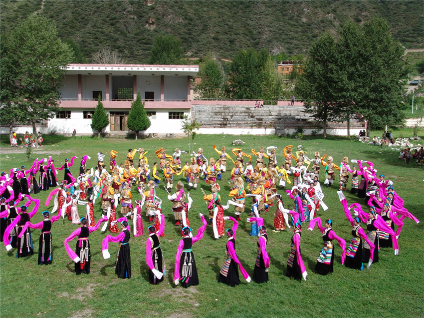 在舞蹈風格上,甘孜鍋莊古樸舒展,尤其是快節(jié)奏階段,旋律熱情明快。男舞者動作粗獷雄健,女舞者秀麗活潑,具有鮮明的地方特色。